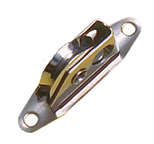 Made from Stainless Steel with a Chrome plated Brass sheave. For use in high load applications such as those imposed by wire and Dyneema halyards. The Stainless Steel side plates prevent highly abrasive ropes from cutting in. Suitable for 4mm Wire, Dyneema, Spectra or Kevlar. Breaking load 950Kg.