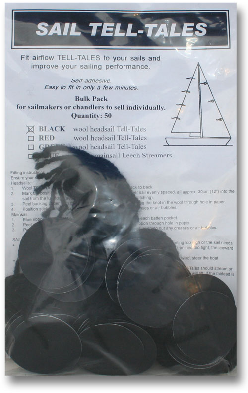 Bulk packs of 50 Tell-Tales in 3 different colours, or 50 Leech-Streamers. Self adhesive, easy to fit. Complete with fitting instructions. Improves your sailing performance: